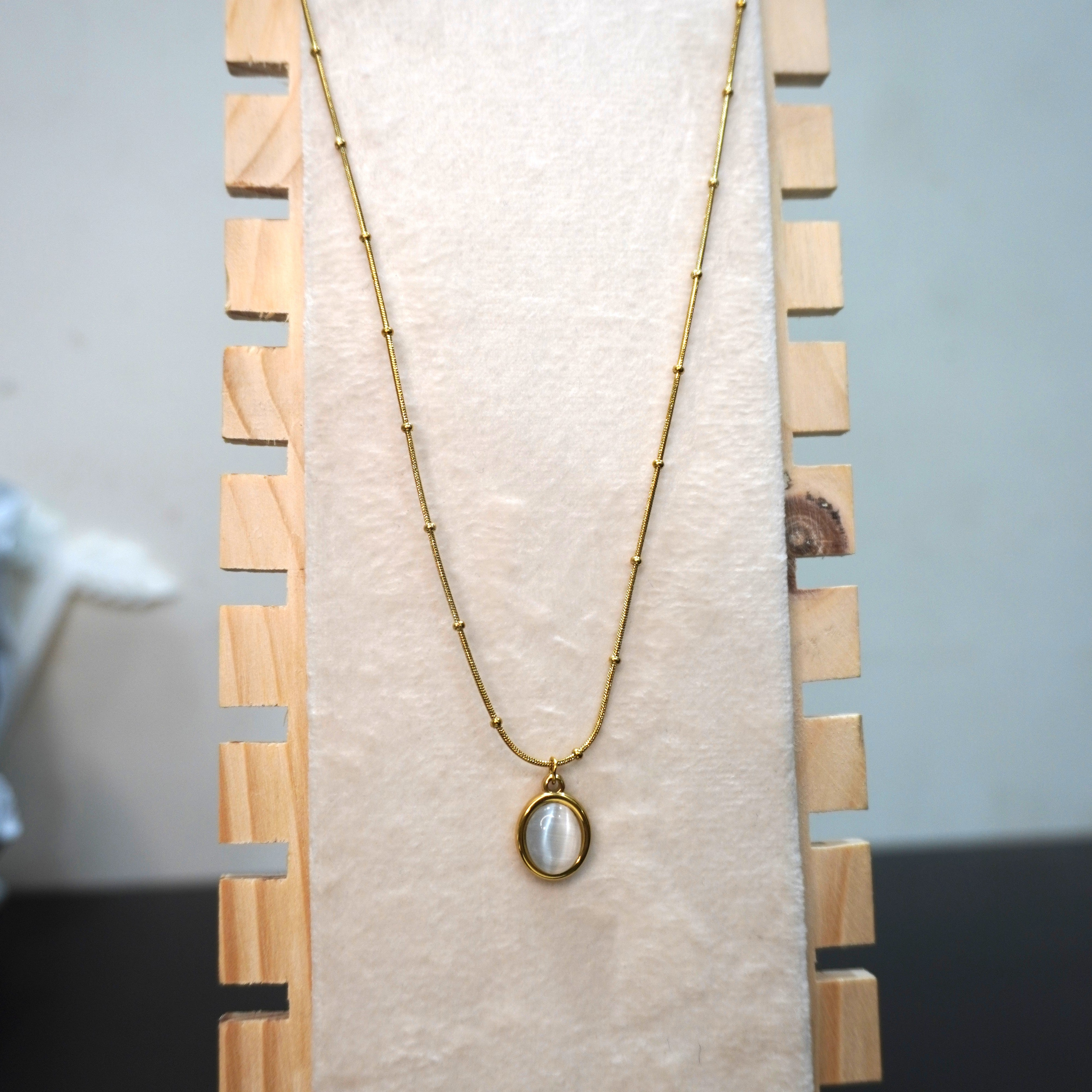 Pendant Detail: A polished oval charm with a shimmering moonstone-effect centerpiece.